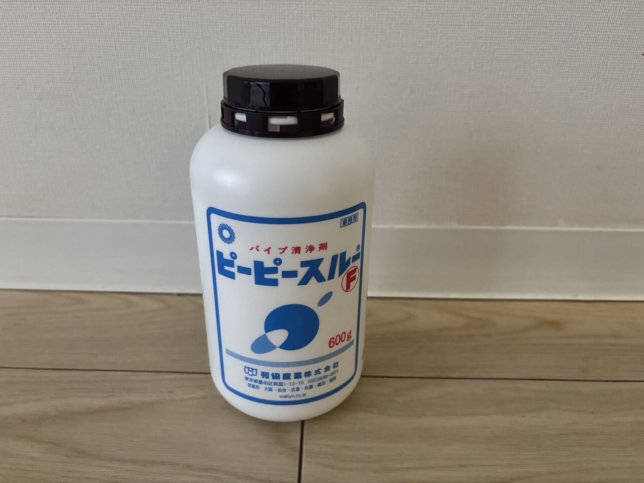 仕方なくマンションの管理会社に連絡したところ、業者さんが使ったのが 「ピーピースルー」 という業務用の排水口詰まり解消剤でした。